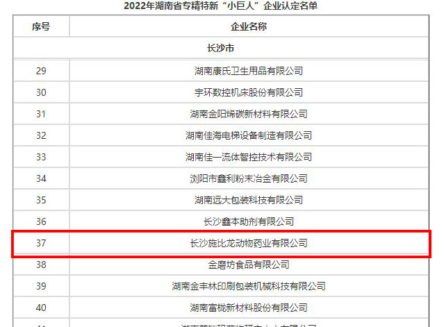 近日,湖南省工業和信息化廳公布了“2022年湖南專精特新小巨人企業名單”。長沙施比龍動物藥業有限公司成功通過認定,榮登2022年湖南省專精特新“小巨人”企業行列。