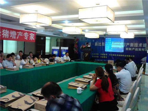 下午,公司營銷副總經理劉明洋作了《母豬增產新技術體系》主題演講,劉總根據目前的豬場形式,母豬繁殖遇到的相應問題,如何提高母豬增產,做了相應的解說。并由此引出公司的主推產品,通過數據實例把我們的產品功效植入客戶腦海,為后述的產品宣傳做了良好的鋪墊。