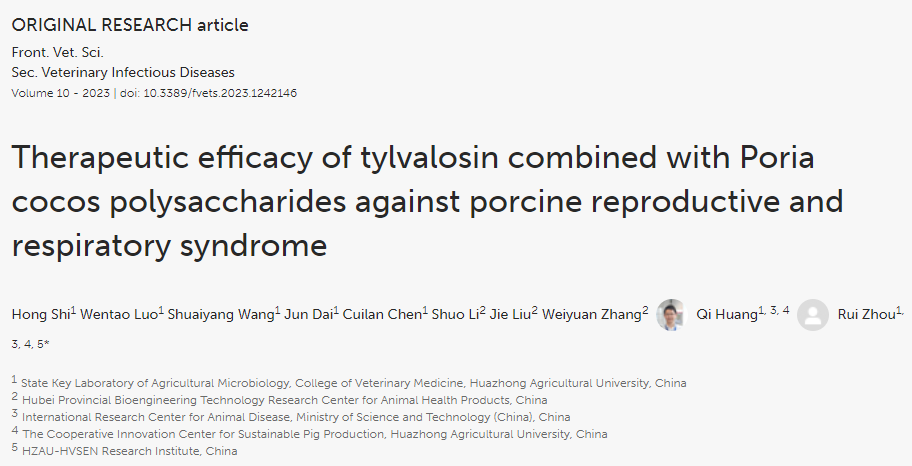 近日,武漢回盛生物科技股份有限公司 (回盛生物)與華中農業大學周銳教授團隊以“Therapeutic efficacy of tylvalosin combined with Poria cocos polysaccharides against porcine reproductive and respiratory syndrome” 為題的研究論文在獸醫學國際權威期刊《Frontiers in Veterinary Science》( 獸醫科學前沿 )上正式發表。該論文是回盛生物“穩藍增免方案” 的理論和實驗基礎,為豬藍耳病防控領域的發展再添強勁技術支撐。