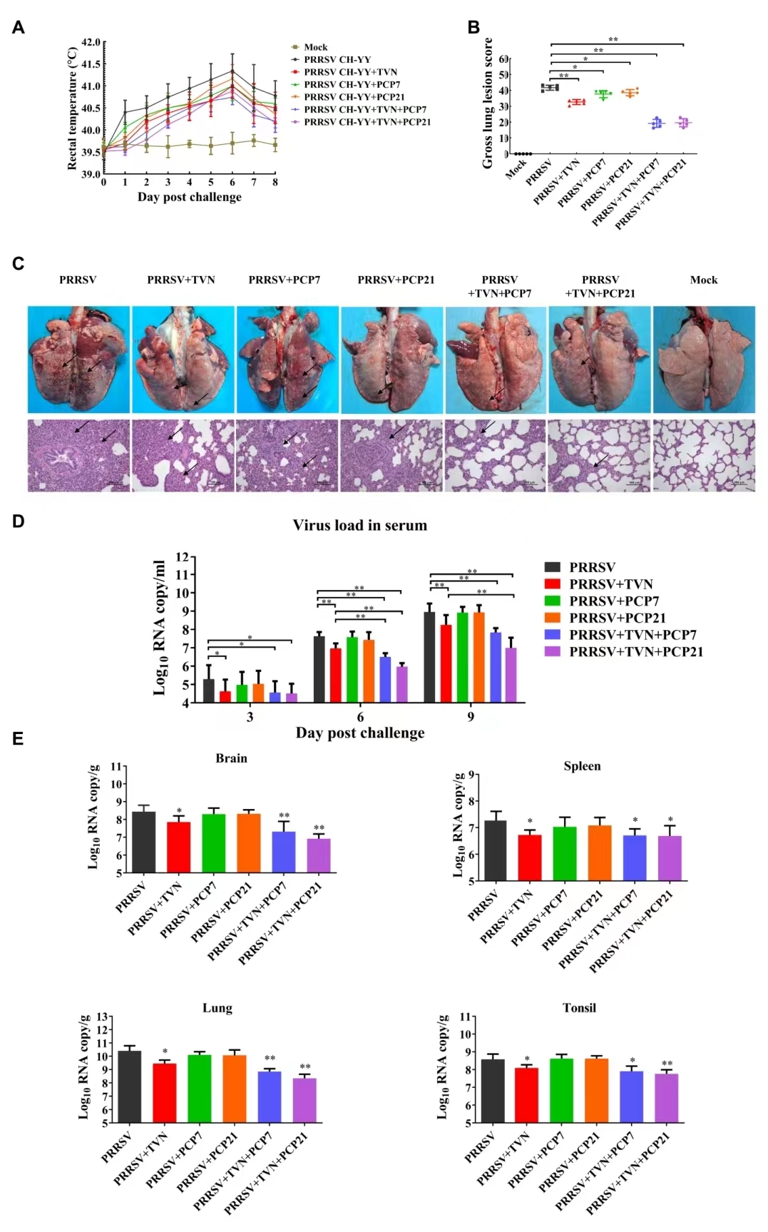 靶動物感染試驗進一步證明:治嗽靜能顯著降低 HP-PRRSV和NADC30樣毒株感染豬的病毒血癥和組織病毒載量,減輕PRRSV感染導致的炎癥反應和肺部損傷,抑制PRRSV感染后的體溫升高,降低豬的日增重損失 ;茯苓多糖(衛免)可以修復PRRSV感染導致的豬免疫抑制,減輕炎癥反應和肺部損傷,降低體溫反應和日增重損失;將治嗽靜與衛免聯用,對藍耳病的防治效果顯著優于單獨使用,顯示出“1+1>2”的效果。