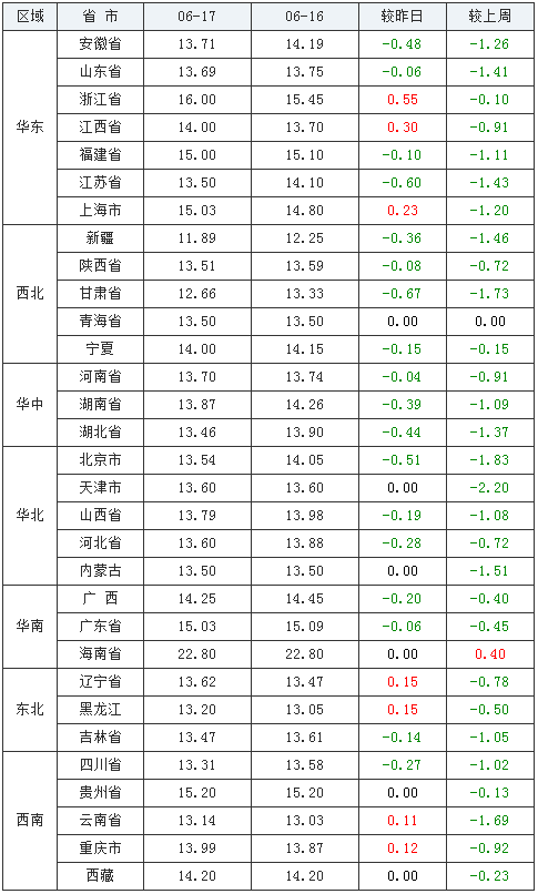 2021年06月17日全國內三元生豬價格行情漲跌表