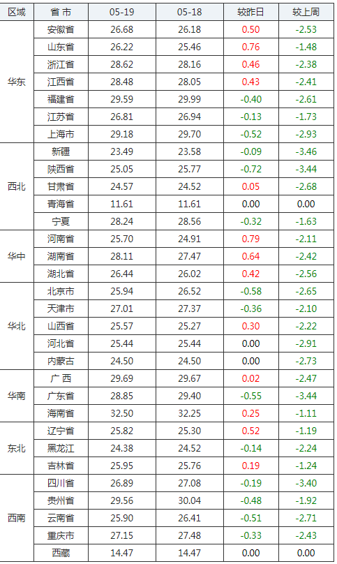 2020年05月19日內(nèi)三元生豬價(jià)格行情漲跌表