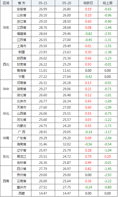 2020年05月21日全國(guó)內(nèi)三元生豬價(jià)格行情漲跌表