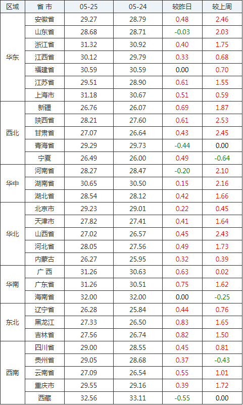 2020年05月25日全國外三元生豬價格行情漲跌表