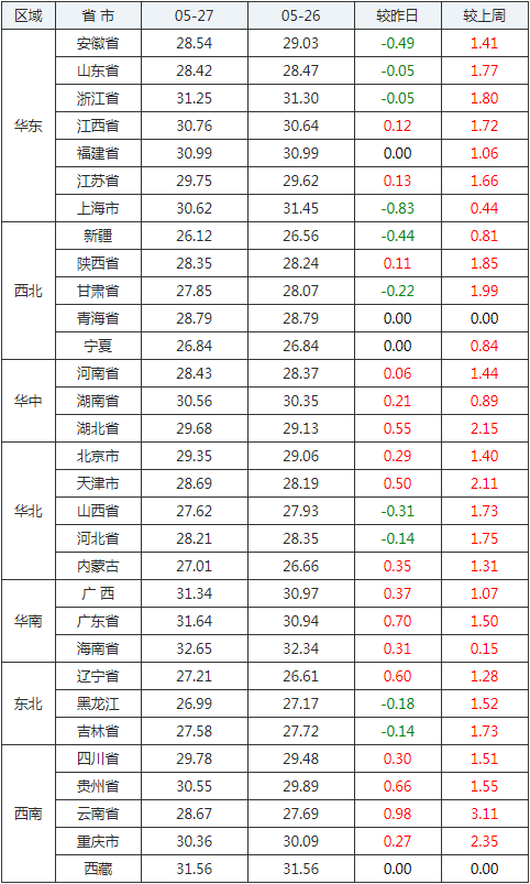 2020年05月27日全國外三元生豬價格行情漲跌表