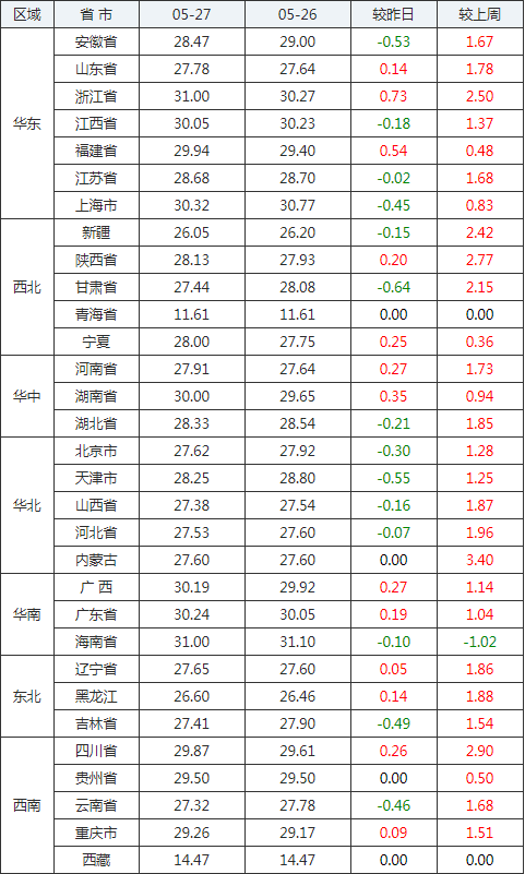 2020年05月27日全國內三元生豬價格行情漲跌表