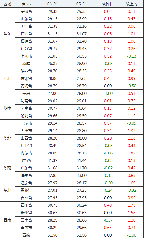 2020年06月01日全國外三元生豬價格行情漲跌表