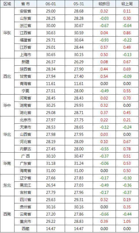 2020年06月01日全國內(nèi)三元生豬價格行情漲跌表