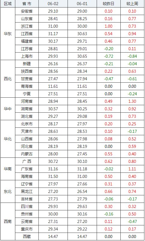 2020年06月02日全國內三元生豬價格行情漲跌表