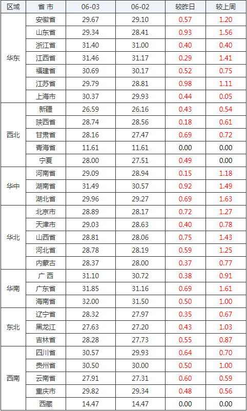 2020年06月03日全國內三元生豬價格行情漲跌表
