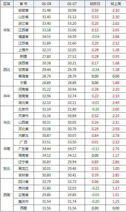 2020年06月08日全國外三元生豬價格行情漲跌表