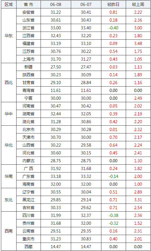 2020年06月08日全國內三元生豬價格行情漲跌表
