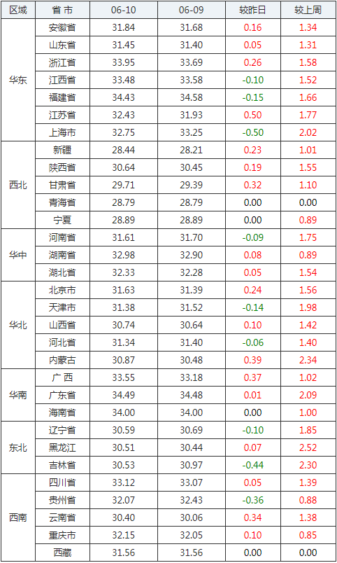 2020年06月10日全國外三元生豬價格行情漲跌表