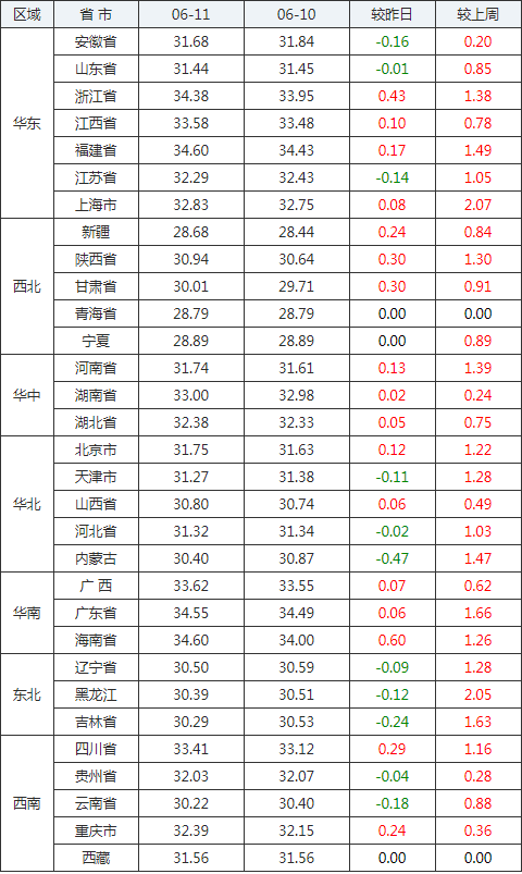 2020年06月11日全國外三元生豬價格行情漲跌表
