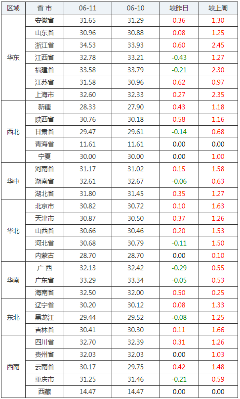 2020年06月11日全國內三元生豬價格行情漲跌表