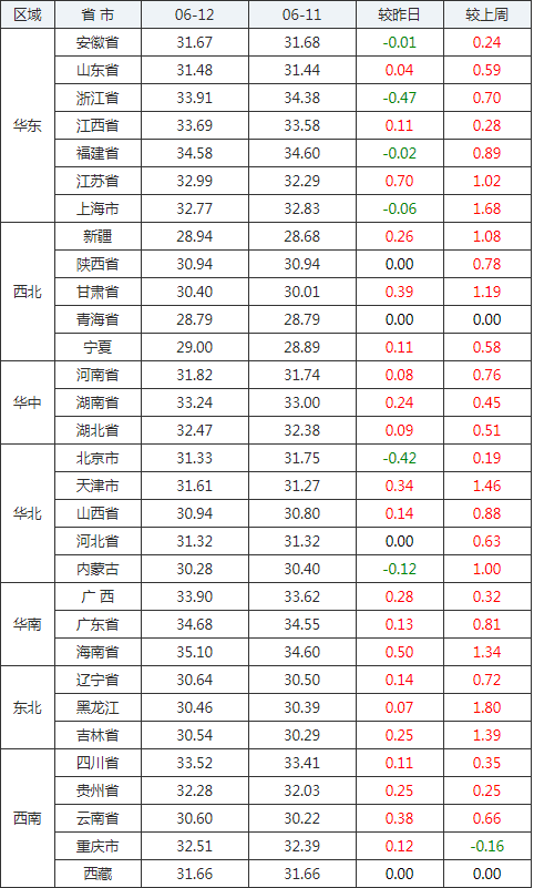 2020年06月12日全國外三元生豬價格行情漲跌表
