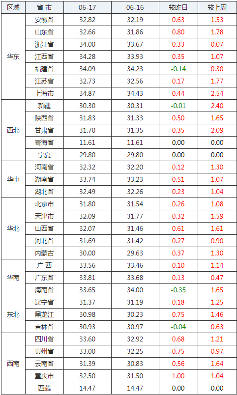 2020年06月17日全國內三元生豬價格行情漲跌表