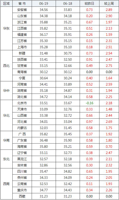 2020年06月19日全國外三元生豬價格行情漲跌表