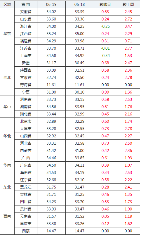 2020年06月19日全國內三元生豬價格行情漲跌表