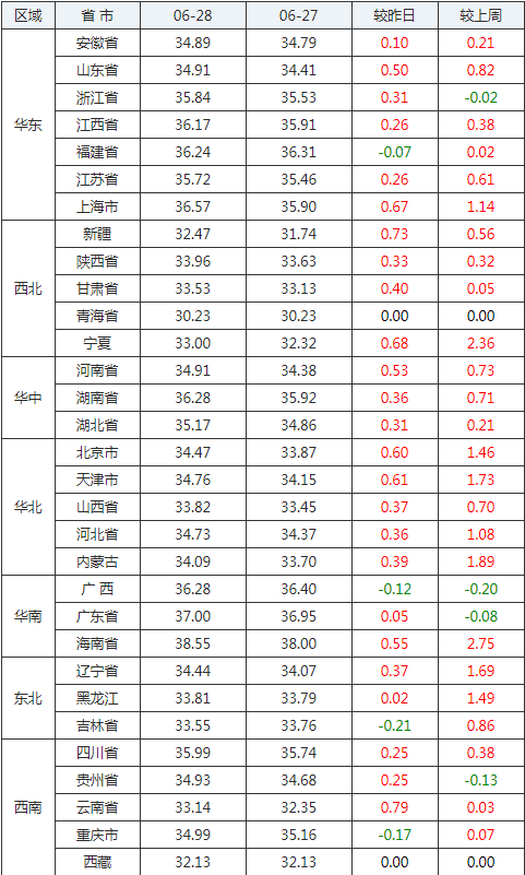 2020年06月28日全國外三元生豬價格行情漲跌表