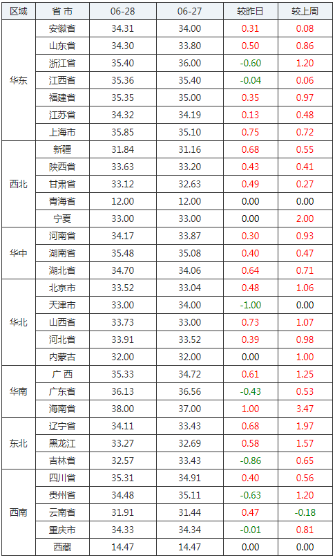 2020年06月28日全國內(nèi)三元生豬價(jià)格行情漲跌表