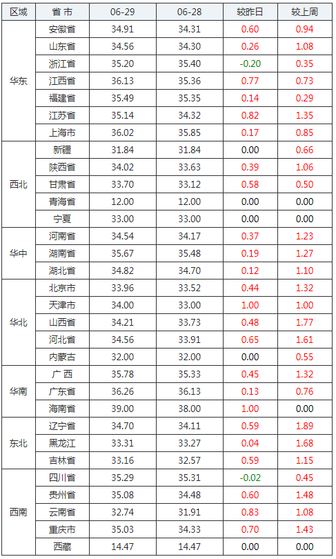 2020年06月29日全國內三元生豬價格行情漲跌表