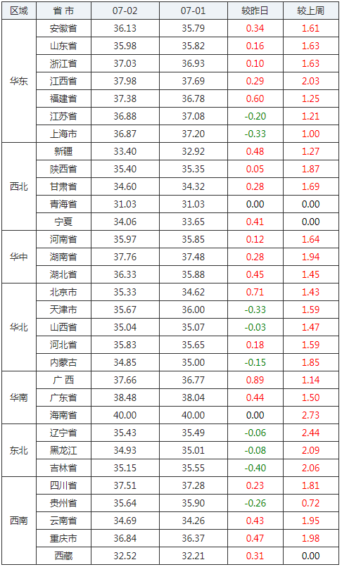 2020年07月02日全國外三元生豬價格行情漲跌表