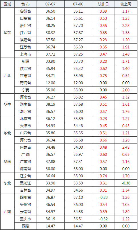 2020年07月07日全國內三元生豬價格行情漲跌表