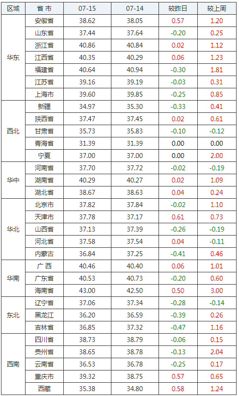 2020年07月15日全國外三元生豬價格行情漲跌表