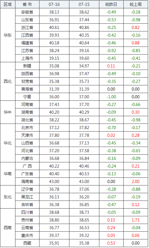 2020年07月16日全國外三元生豬價格行情漲跌表