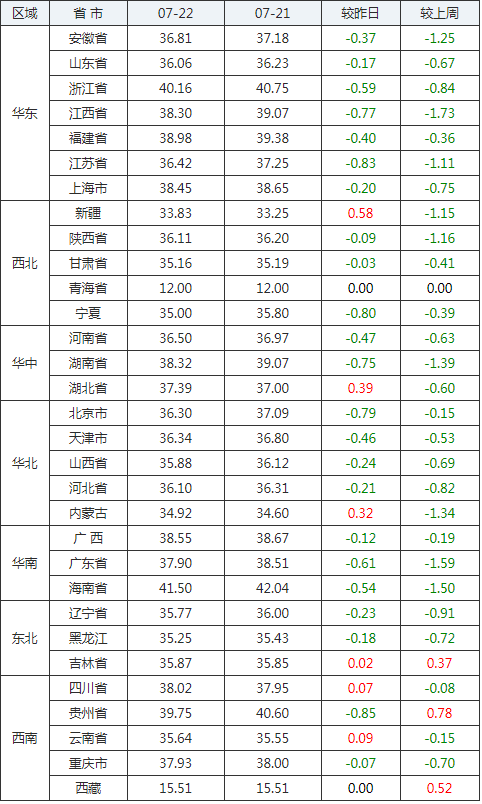 2020年07月22日全國內(nèi)三元生豬價(jià)格行情漲跌表