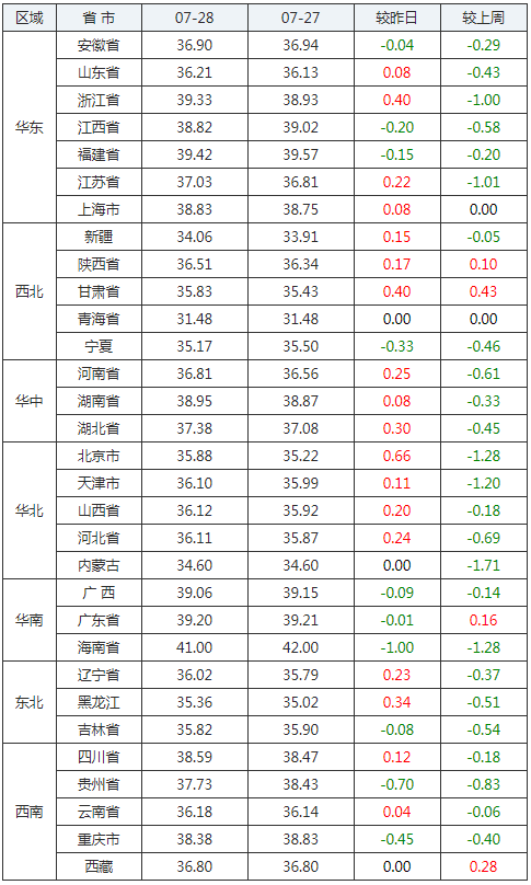 2020年07月28日全國外三元生豬價格行情漲跌表