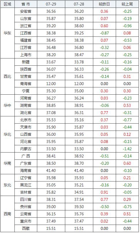 2020年07月29日全國內三元生豬價格行情漲跌表
