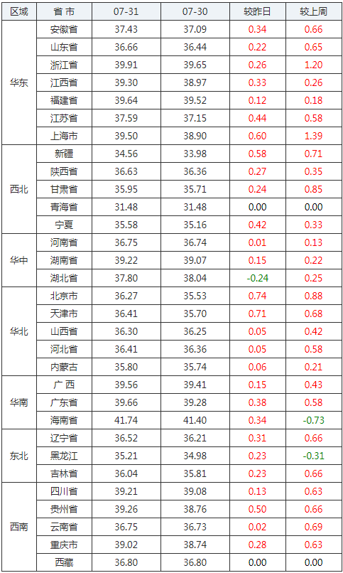 2020年07月31日全國外三元生豬價格行情漲跌表