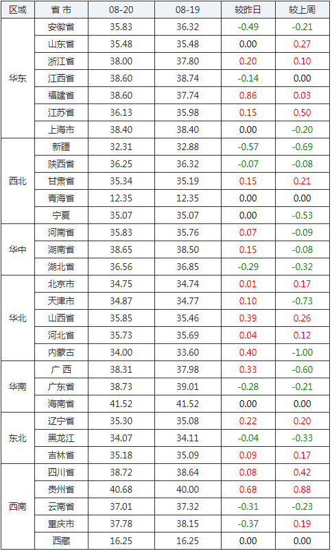 2020年08月20日全國內三元生豬價格行情漲跌表