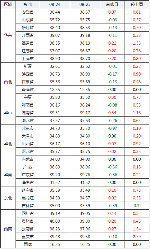 2020年08月24日全國內三元生豬價格行情漲跌表