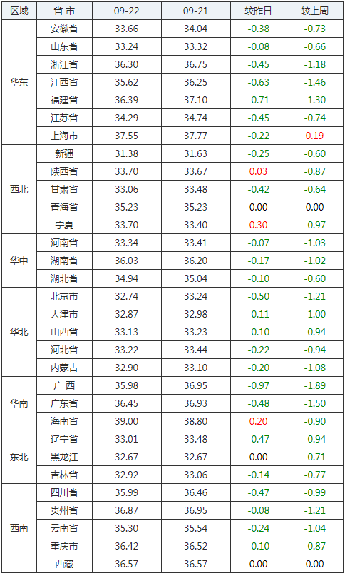 2020年09月22日全國外三元生豬價格行情漲跌表